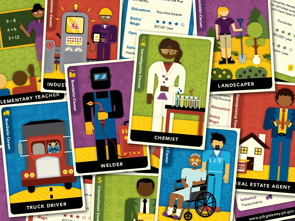 This is a set of Occupational Trading Cards for elementary school students to promote interest in potential careers. A set of icons was illustrated for the different career industries, and facts are shown using a 5-star rating system, to be accessible for the students.